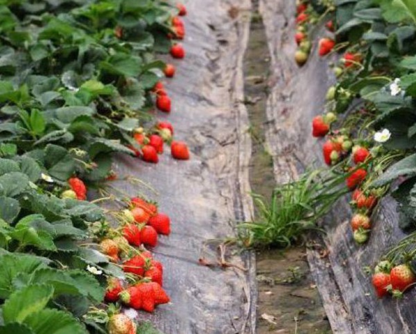1.覆膜方法   春季覆膜应在土壤开始化冻时进行。先平整地面,打碎土坷垃,除去残茬,选择无风天气覆膜,顺行把地膜平铺覆盖在草莓植株上,要求膜面伸展不卷,地膜周围压土盖严。如畦面过长,可间隔适当距离横向压土,使膜不致被风刮起撕破。膜面可再覆盖作物秸秆,以保温并起到护膜作用。草莓垄栽时,垄应略呈弓形,以便搏膜与土壤贴紧。